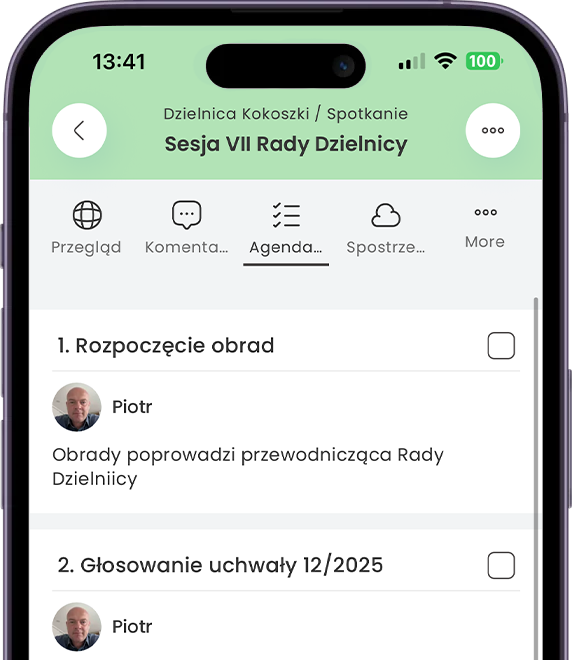 W Teamee możesz łatwo zorganizować spotkanie stacjonarne lub online, przygotować agendę, sprawdzić obecność i przeprowadzić głosowania. Aplikacja powiadomi wszystkich uczestników o terminie i miejscu, a po jego zakończeniu będziesz miał cały czas dostęp do wszystkich notatek, ustaleń i plików.