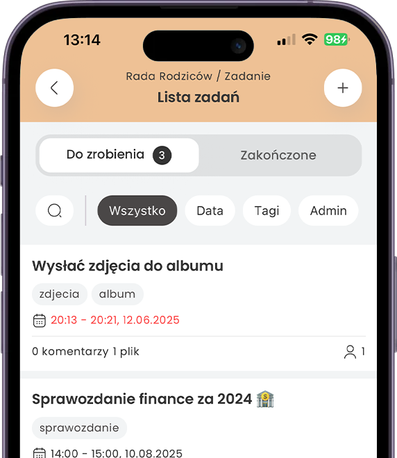 spotkania, zadania i inne treści w aplikacji